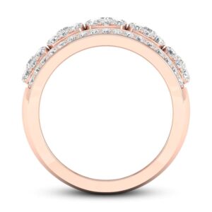 Clusters of dazzling round diamonds adorn the center band of this elegant women’s ring. Even more brilliant round diamonds border above and below the center to complete the look. Fashioned in 14K rose gold, the total diamond weight of the ring is 1 1/5 carats.