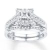 This stunning bridal set for her features a princess-cut diamond at the center of the engagement ring, framed in twinkling round diamonds. Additional round diamonds are channel-set into the 10K white gold band of the engagement ring and the matching wedding band. The bridal set has a total diamond weight of 5/8 carat.