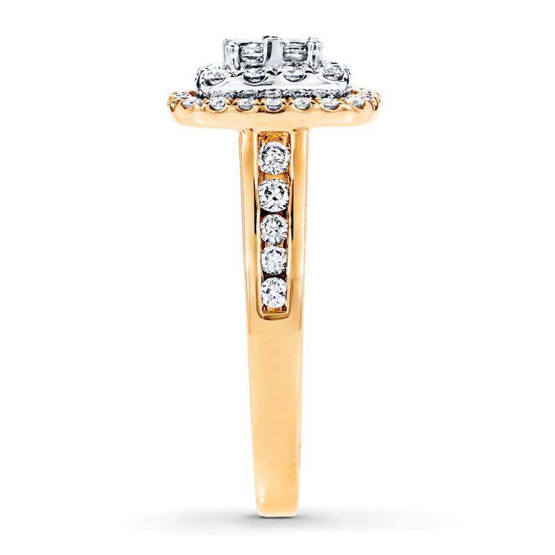 Framed by two rows of round diamonds, four princess-cut diamonds sparkle together in this beautiful engagement ring. The 14K yellow gold band glitters with channel-set round diamonds, bringing the total diamond weight to 3/4 carat. The center diamonds are set in 14K white gold.