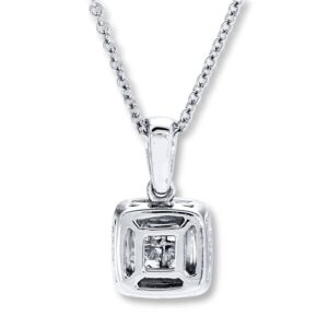 Four princess-cut diamonds are beautifully framed in round diamonds in this gorgeous necklace for her, crafted of 14K white gold. The necklace has a total diamond weight of 1/2 carat. The pendant sways from an 18-inch cable chain that secures with a lobster clasp. From the Four One? Collection.