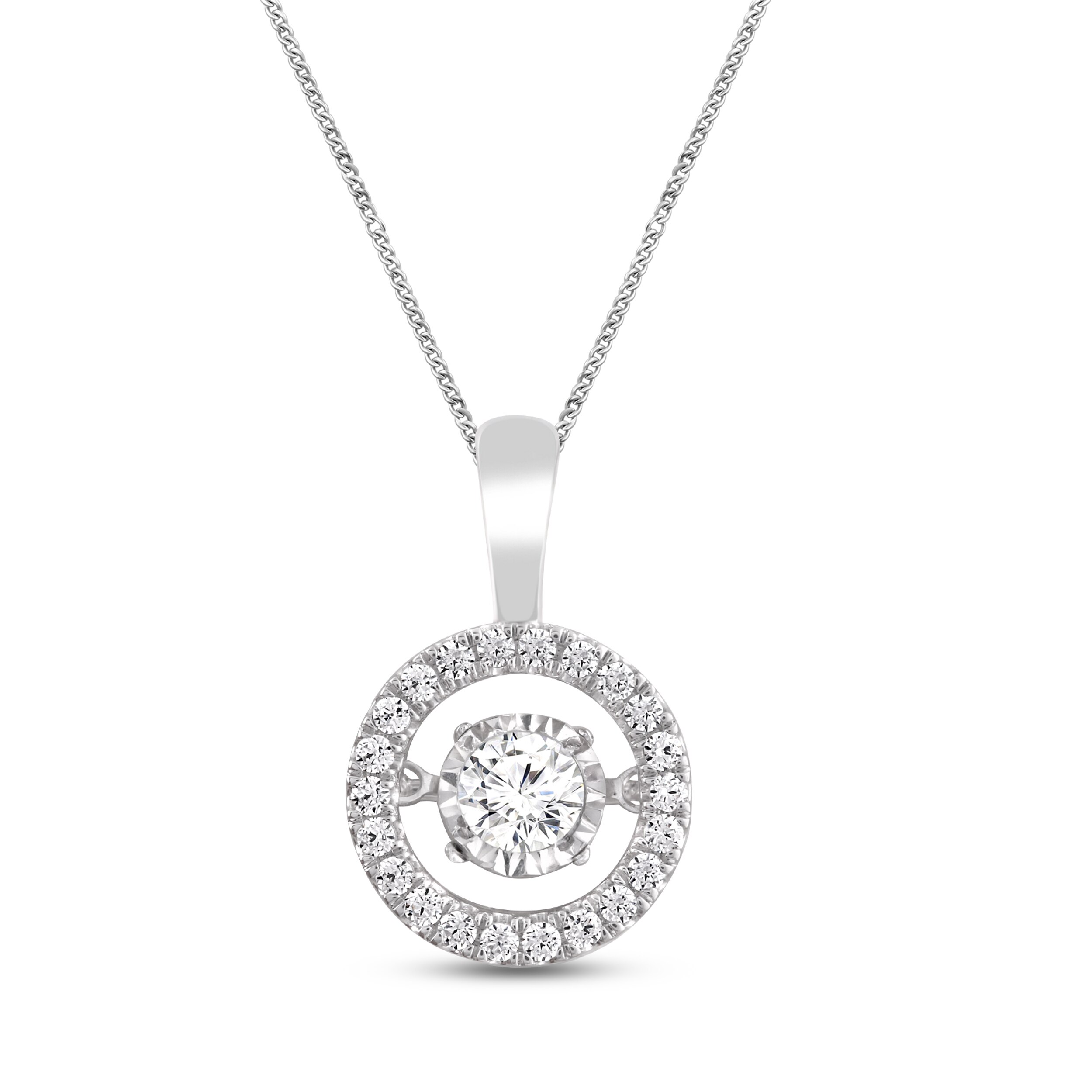A dramatic round diamond dances gracefully in the center of this stunning necklace for women. Additional round diamonds set in 10K white gold surround the center. With a total diamond weight of 1/2 carat, this pendant hangs from a 19″ curb chain and secures with a clasp.